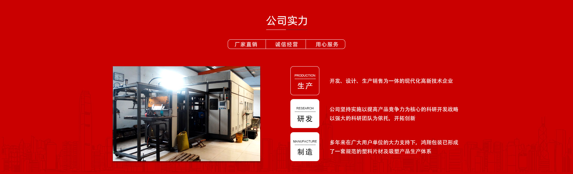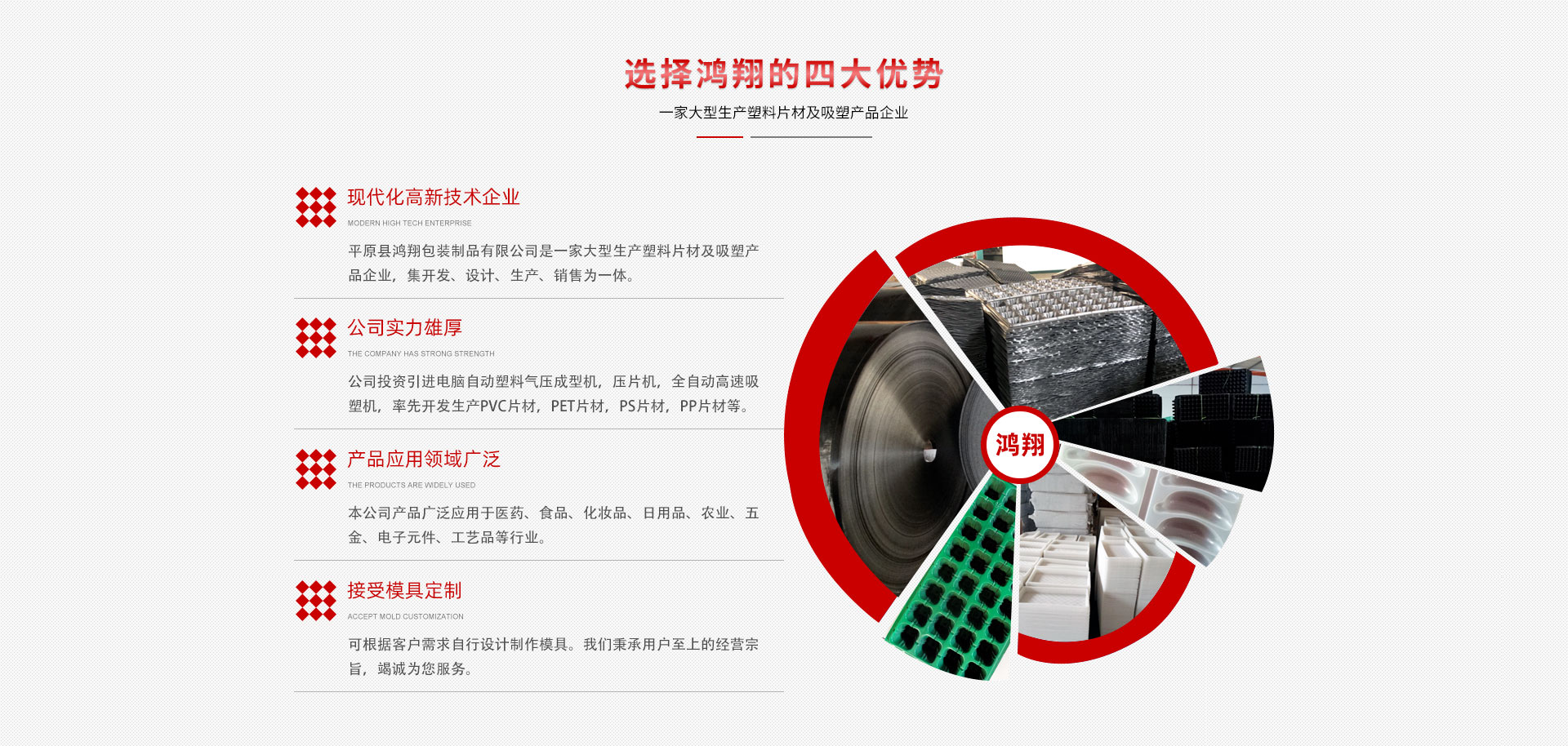 平原縣鴻翔包裝制品有限公司是一家大型生產(chǎn)塑料片材及吸塑產(chǎn)品企業(yè),本公司投資引進(jìn)電腦自動(dòng)塑料氣壓成型機(jī),壓片機(jī),全自動(dòng)高速吸塑機(jī),率先開(kāi)發(fā)生產(chǎn)PVC片材,PET片材,PS片材,PP片材等,鴻翔是國(guó)內(nèi)先進(jìn)的生產(chǎn)廠家之一。本公司產(chǎn)品廣泛應(yīng)用于醫(yī)藥、食品、化妝品、日用品、農(nóng)業(yè)、五金、電子元件、工藝品等行業(yè),也可根據(jù)客戶(hù)需求自行設(shè)計(jì)制作模具。本公司技術(shù)力量雄厚,生產(chǎn)設(shè)備工藝先進(jìn)。我們秉承用戶(hù)至上的經(jīng)營(yíng)宗旨,竭誠(chéng)為您服務(wù)。